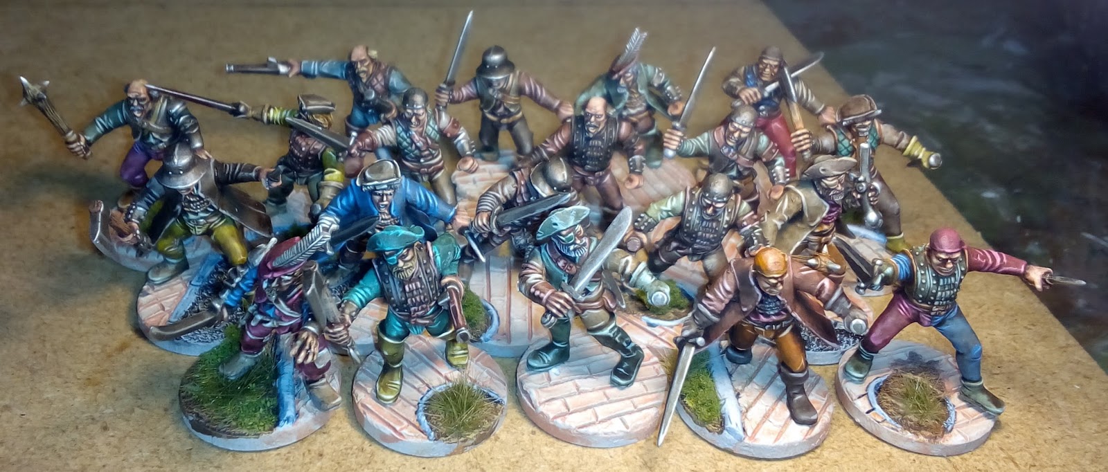 Como si fuéramos escolares coloreando un dibujo, pero en este caso con miniaturas de 28 mm. Este paso consiste en aplicar los colores base en todas las zonas de todas las miniaturas, salvo la piel.