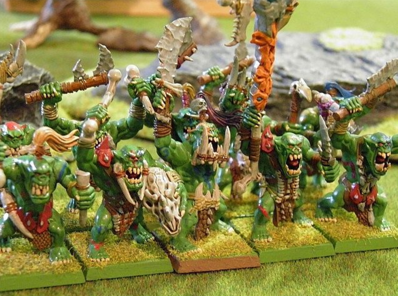 - Solo rebanadora: La opción básica, unos tíos inmunes a psicología (y por ende a pánico) con 2 ataques por cabeza y F4 el turno que cargan. Confías todo a ser el que carga, y avasallar a bajas para reducir los ataques en respuesta. No es una mala opción si la vas a usar como unidad barata (son 6 puntos cada orco) o si juegas contra ejércitos que dan miedo, como Condes Vampiro, Reyes Funerarios o Reinos Ogros. Además dado su bajo coste, puedes hacer unidades relativamente grandes y contar con bonus de filas, a veces potencia y si te animas portaestandarte. Vamos, es una unidad prescindible, que ganará combates a unidades de apoyo y que puedes usar tú mismo como apoyo en un momento dado. Por supuesto, para jugar agresivo, como todos los salvajes.