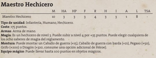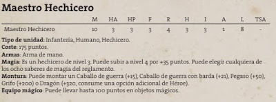 Y aquí viene nuestra opción mágica de comandante. Con un coste base de 175 puntos, que en el 99% de los casos subiremos a nivel 4 para ganar ese dado y hechizo, nos queda un hechicero de 210 puntos. Un coste relativamente bajo comparado con otros ejércitos, de nuevo, haciendo de esta su mayor ventaja y pudiendo elegir cualquiera de los 8 saberes básicos.