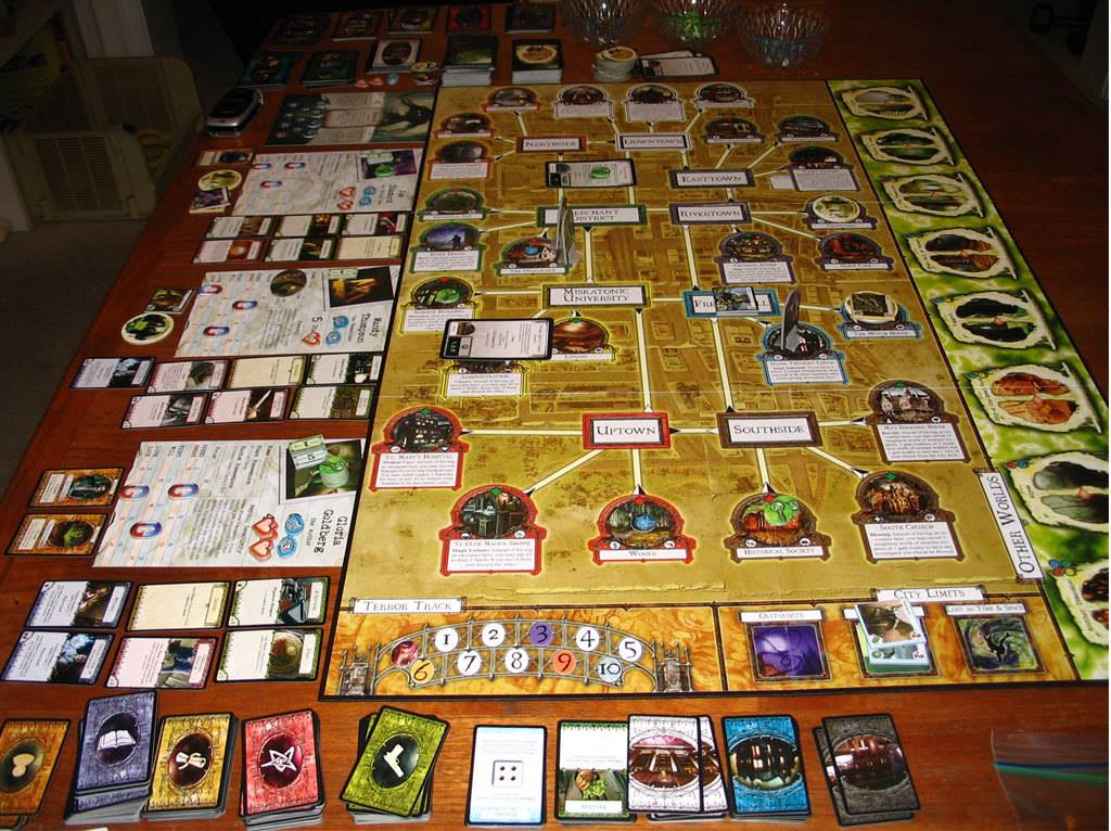 -¿Todavía hay más? Pues sí, luego los monstruos tienen habilidades, como ser inmunes a armas mundanas por ejemplo. También hay un límite de monstruos en la ciudad, si salen más del portal, se quedan en las afueras, y si se llenan, el nivel de peligro en la ciudad aumenta y un habitante se marcha. Luego te empiezan a cerrar las tiendas y se arma el lío padre. Luego aparte de armas y objetos de un solo uso, se ganan habilidades (normalmente repetir dados o +1 de alguna estadísticas) y aliados (lo mismo). También existe una casilla llamada "Lost in time and space" que es lo que pase cuando te destrozan mientras investigas en Otros Mundos, y pierdes el turno para reaparecer dios sabe donde.