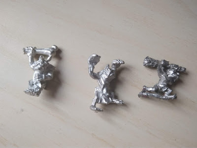 Normalmente me metería directamente en harina, pero creo que lo interesante del artículo son las miniaturas en sí, así que esta vez he sacado fotos de todas. Me hacen mucha gracia porque hay de todo: desde un par que colgaban de la vagoneta, a uno en plan chamán, un tipo con trompeta y bandera (¿músico y portaestandarte?), otro subido a hombros de un pringao y con tirachinas, hay varias lanzas, mazas, mazas de hueso, uno que se rasca el trasero, dos con redes, otro se saca un moco...me parecen geniales y que recogen bien el carácter de la unidad.