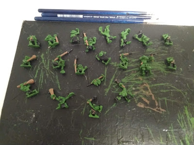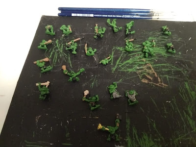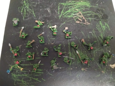 En cuanto a pintura en sí...para empezar, verde en la piel y marrón en la madera (principalmente garrotes o astas de lanza) y cuerdas de cinturón.