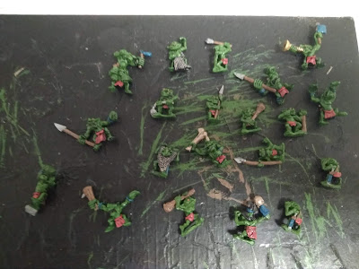 Buenos días verdes. Hace poquito pude participar en el 4º Torneo Corredores de Sombras, e intenté en las semanas previas llevar tantas cosas pintadas como fuera posible. Lo último que conseguí pintar fueron estos snotlings, que aunque no tienen nada de especial desde el punto de vista de pintura, son un lujo de miniaturas, muy graciosas, y quería enseñarlas (de 20 que tengo, hay 19 modelos distintos). Os los presento.