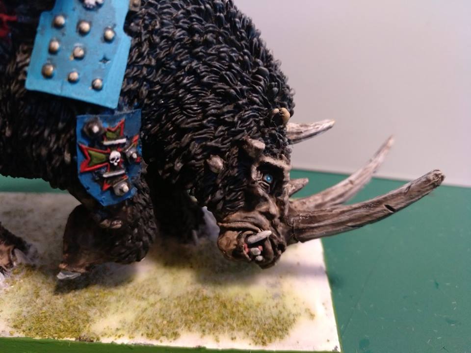 2. El Rhinox: lo encuentro muy bueno. Uno solo tiene una peana muy pequeña que cabe por todas partes. Lo veo como un monstruo, con armadura +2, potencia de la unidad >5, terror, 4 ataques de F6, 3 de F4 que penetran, y 1D3 impactos por carga... por 161 puntos. Como es el bicho que más asusta del ejército, la gente tiende a dispararle a él, librando al resto del ejército -que va sin armadura- de pánicos y demás.