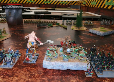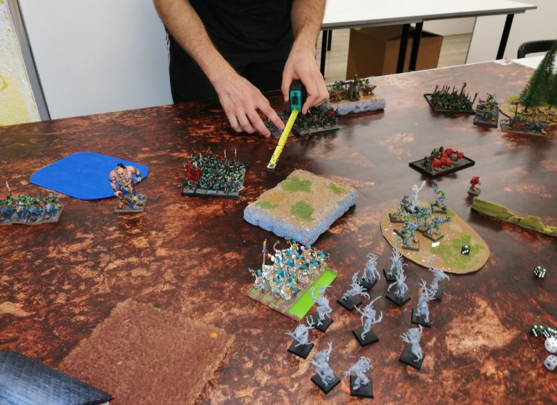 Su despliegue de izquierda a derecha según lo veía yo fue como sigue: Una unidad de 5 goblins en lobo, un gigante, una unidad de goblins nocturnos con chamán dentro, un carro de lobos, otra unidad de goblins nocturnos con chamán dentro, los dos lanzavirotes y el lanzapiedraz en la colina central, delante de la colina los garrapatos y detrás de la misma el superchamán, después iba el otro gigante, el otro carro, otra de goblins nocturnos con otro chamán, la otra de lobos y los snotlings.