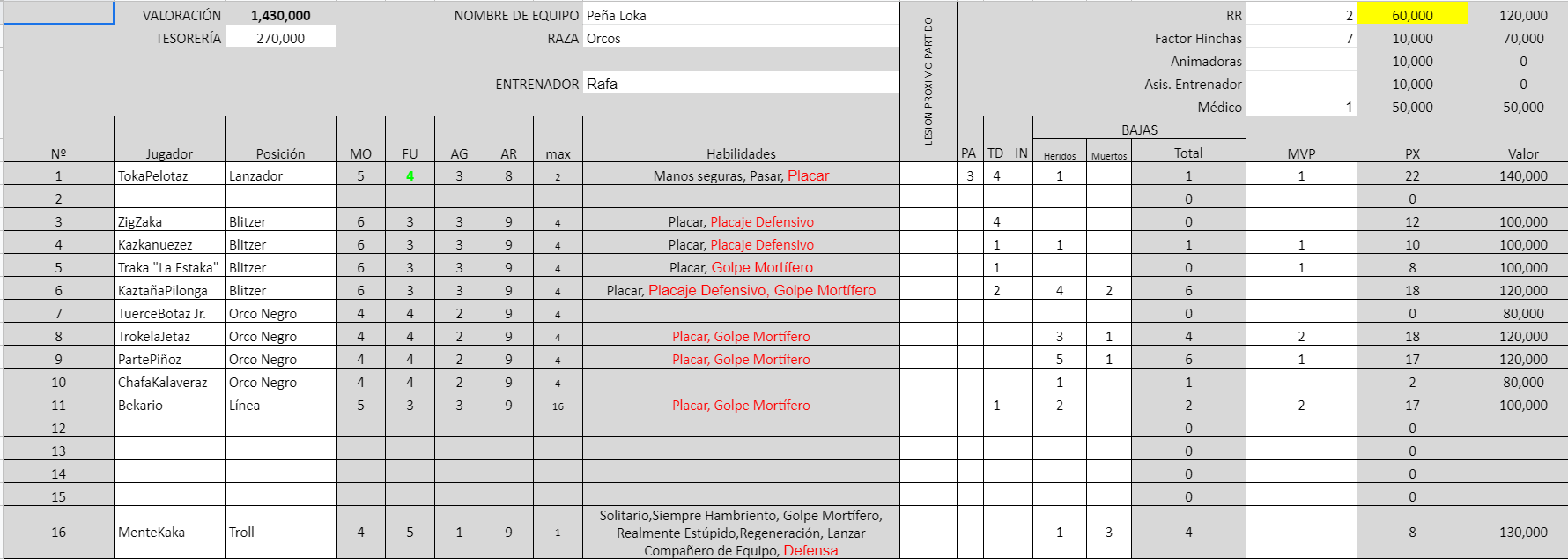El equipo de Rafa era francamente temible, recordaba al troll con Defensa, pero ver tal cantidad de Placar, Fuerza 4 y Golpe Mortífero, cuando tenía hasta tres jugadores con la armadura reducida por lesiones, me hacía entrar sudores fríos.