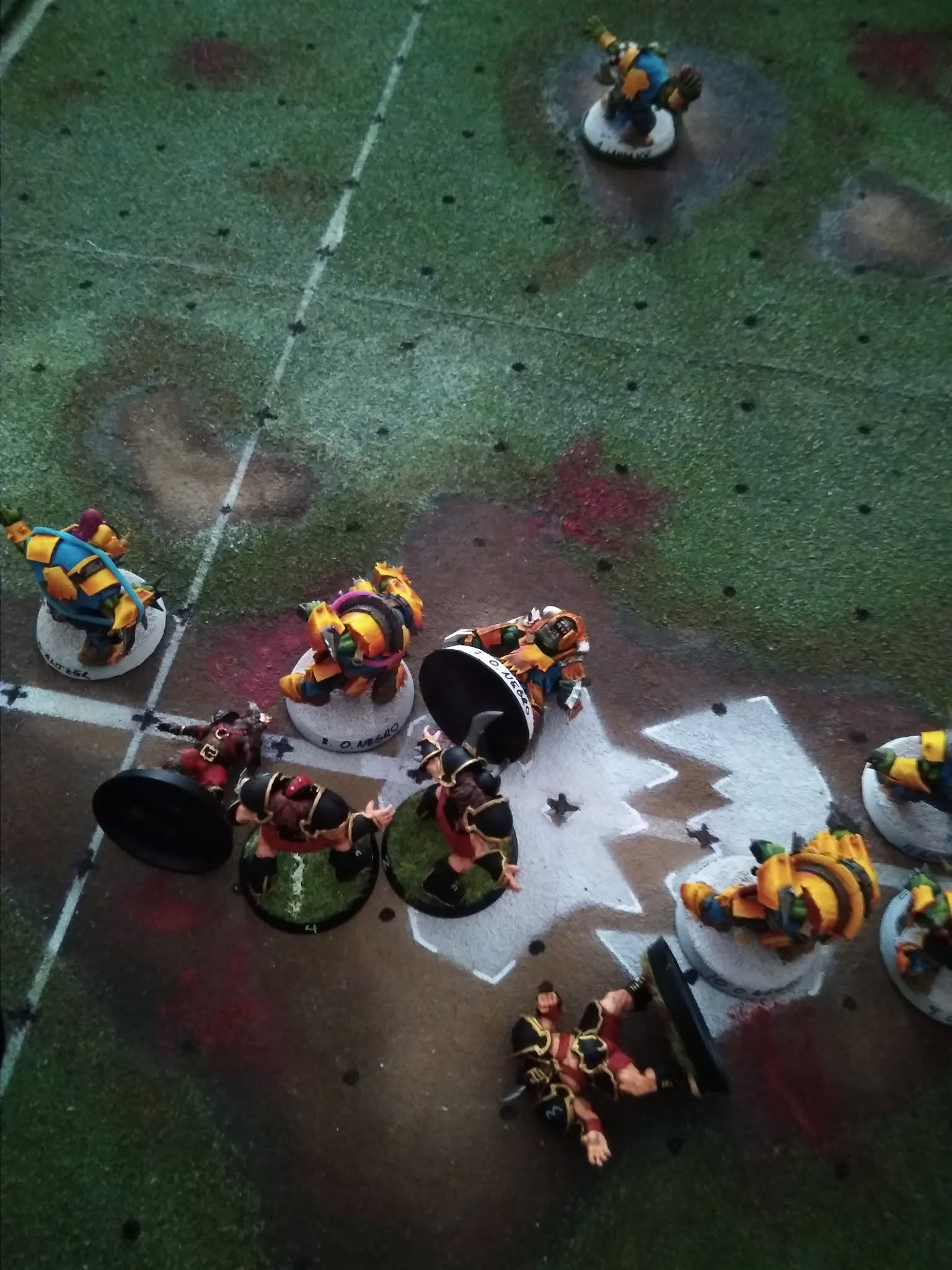 Esto podía ser durillo si Rafa aprovechaba, pero aquí echó de menos las segundas oportunidades. A medio turno un placaje tonto salió ambos derribados a un orco negro sin placer y acabó con su turno. Eso sí, mi cabra acabó KO, ni tan mal.