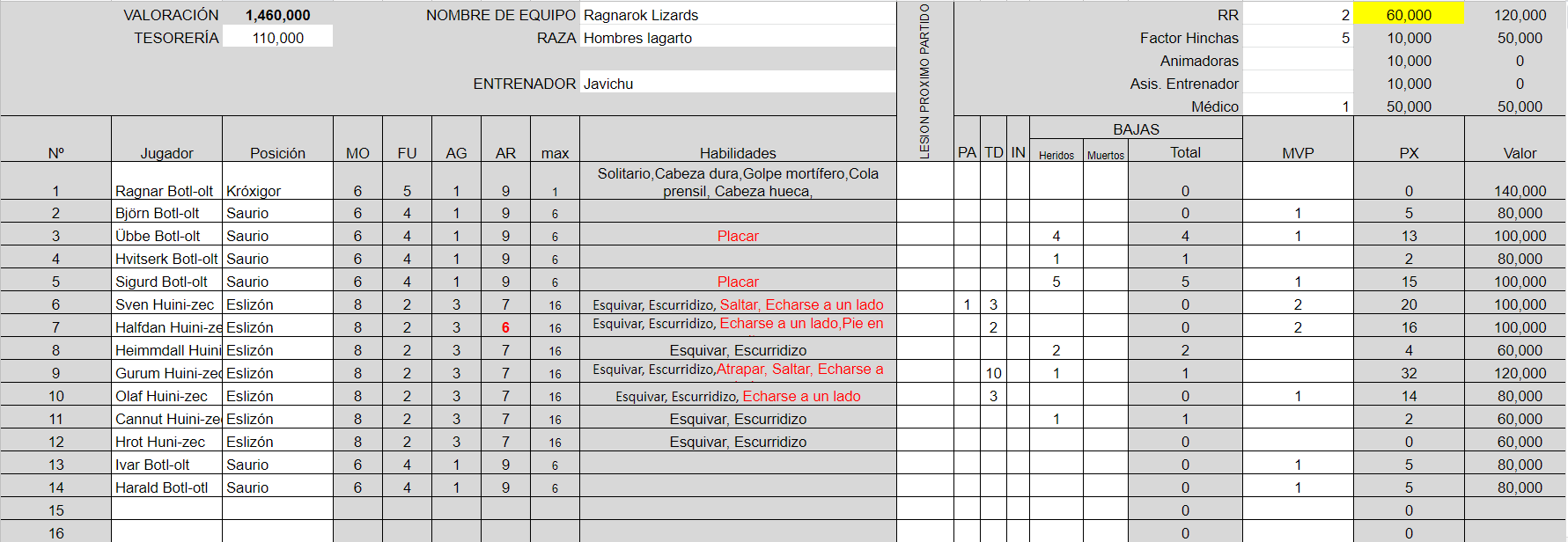 Javi tenía un equipo en línea con el mío, con varios saurios sin subir, y un kroxigor que había tenido que ser refichado tras morir, aunque varios eslizones tenían unas cuantas habilidades. En general los lagartos son un gran equipo, contra el que el plan suele ser intentar meter mano a los eslizones tan rápido como sea posible para generar superioridades y dificultar el manejo de balón, pues el resto de jugadores también son sorprendentemente móviles, pero no ágiles.