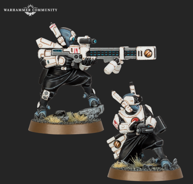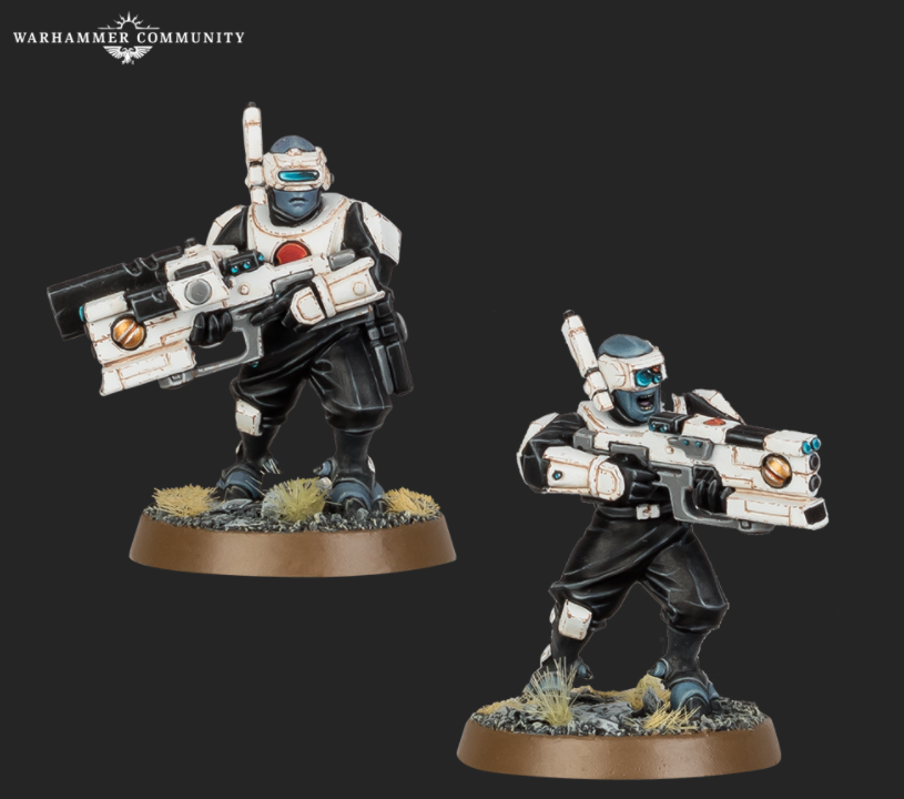 En el lado de los T'au en cambio he leído bastante más decepción, ya que simplemente han añadido una matriz (como lo de los Cadianos hace nada) a la caja básica de Pathfinders, y más allá de las gafas para todos, no parece una personalización tan molona. Yo creo que aquí sí que la han cagado con el esquema de pintado, ya que para hacerlos parecer diferentes de lo habitual un esquema de infiltración/camuflaje hubiera sido mucho más adecuado.
