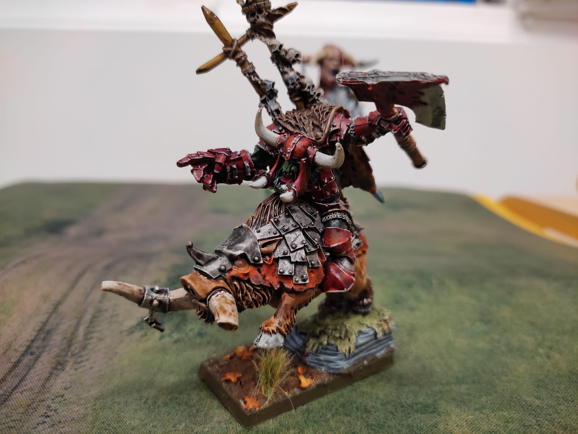 Yo siempre suelo empezar una lista por el concepto de lo que quiero hacer con ella, y a partir de ahí, me creo una base en mente sobre la que girará (Nota de Cordo: Así me gusta, hay que tener un plan). En este caso, sabía que tendría al menos un par de grandes peñas que avancen en medio, con un porta de batalla que les diera estabilidad. Hemos venido al combate, hay que hacerlo bien. También sabía que llevaría un único “mago” (no hay más opciones), y al menos otro personaje pegón que fuera el general (tiene que ser un gran jefe o kaudillo, y no puede ser el porta de batalla). Aparte de esto, sabía que querría llenar al máximo las opciones de carros y jabalíes de las que dispongo (ya que me sirven de caballería, de redirectoras, para cazar máquinas de guerra, para sacar fanáticos… ¡Todo lo hacen los cerdetes!), y que como singulares habría un Kareto de Gorko, y un gigante.