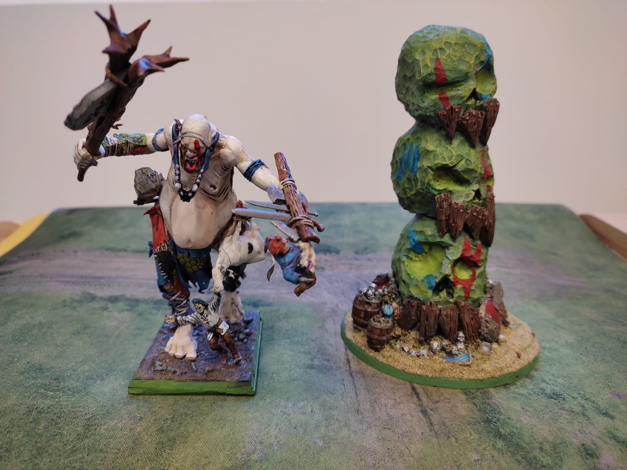 ¿Por qué el gigante? El gigante no es una opción que vaya siempre bien. Cuesta muchos puntos, y siendo objetivo grande, con R5 y sin armadura, es una diana muy suculenta. Sin embargo, este torneo tiene una cosa especial a la que tenemos que adaptarnos: los contrincantes son todos pielesverdes. Además, en nuestro grupo de juego hay muchos fans de los goblins nocturnos. Así que hice mi ejército basándome un poco en cómo enfrentarme contra ellos, ya que al consistir mi ejército en una base de tropas cuerpo a cuerpo, son el tipo de ejército al que más me va a costar enfrentarme: sus sucias artimañas, que rehúyan el combate (u ofrezcan tropas de costes irrisorios para entretenerme) podían anularme totalmente.