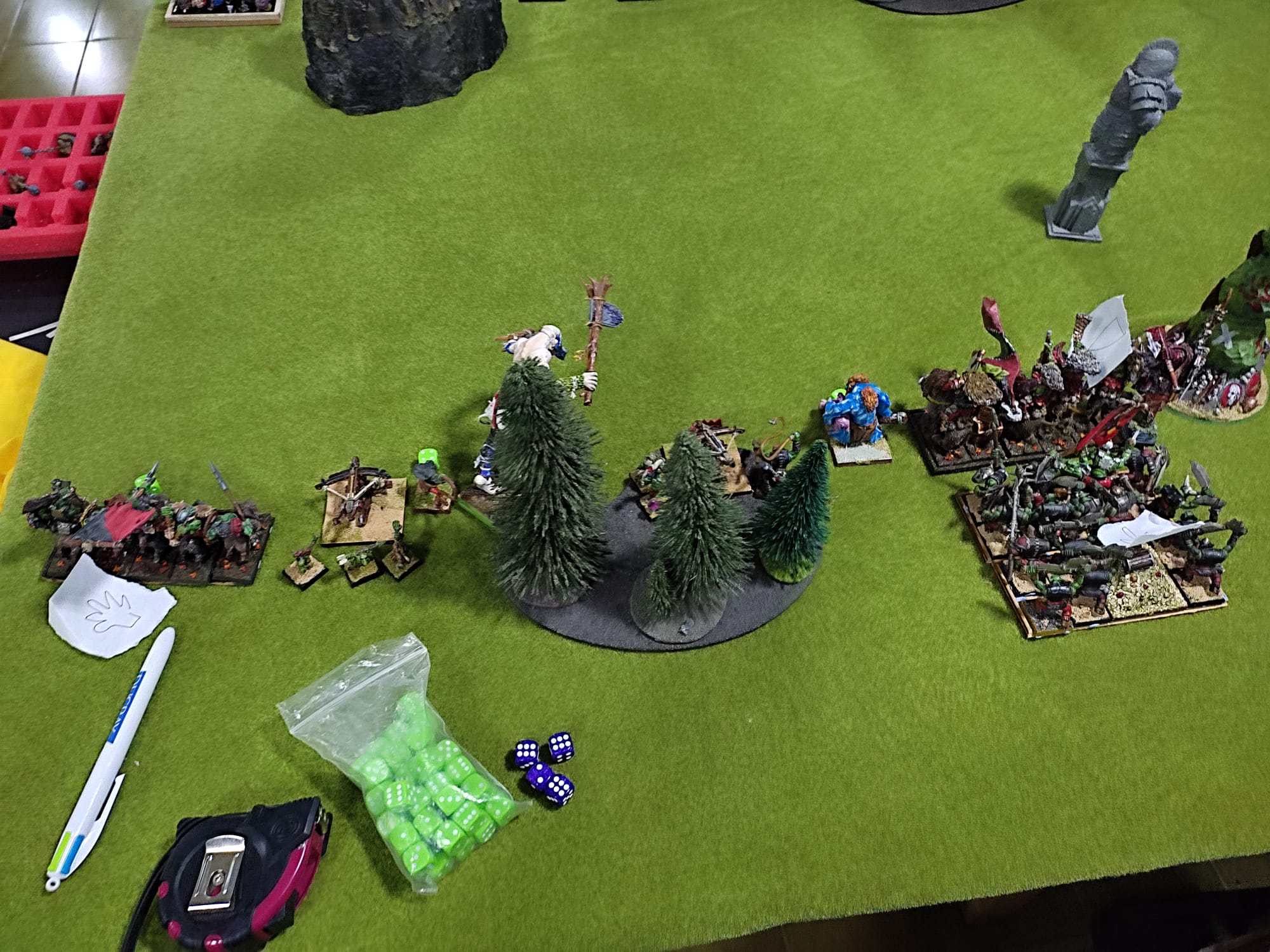 Pero además, hay un “factor verde” extra a considerar. Las unidades de 10 orcos o 20 goblins amigas, o enemigas, trabadas en combate, dan dados adicionales de magia. Si mis rivales son todos pielesverdes, y van con grandes chamanes, me pueden reventar a magia. Si cada una de mis unidades que trabo en combate son un dado de energía extra, y si las suyas son grandes, un dado adicional… necesito más potencia mágica para que no me sobrepasen. Y… si puedo aprovecharme yo también de ello, mejor que mejor.