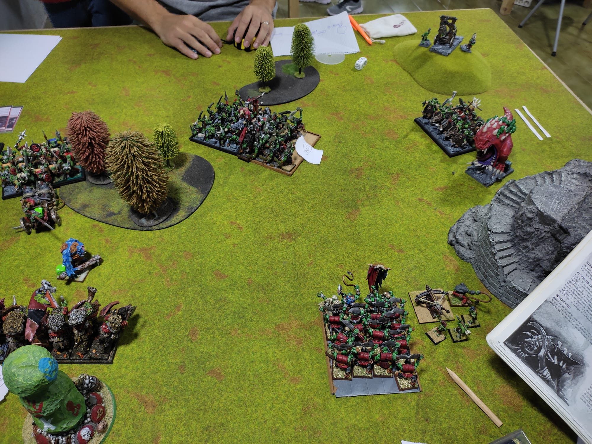 Se trataba de un torneo amistoso (y animoso XD), con 10 participantes (9 de ellos pielesverdes, y 1 Hobgoblin, que venía con ganas de liarla pero consciente de la dificultad de hacer algo decente con su lista tan limitada y sin magia). ¡Nada mal para ser solo pielesverdes! Había un poco de todo: muchas listas mixtas de orcos y goblins, al menos una de goblins nocturnos, un par de Kaudillos goblins nocturnos en garrapato (¡con un par!), EMiN con su lista de la Mamá Troll (Bruja Troll), y un servidor con la alternativa de Machotez.