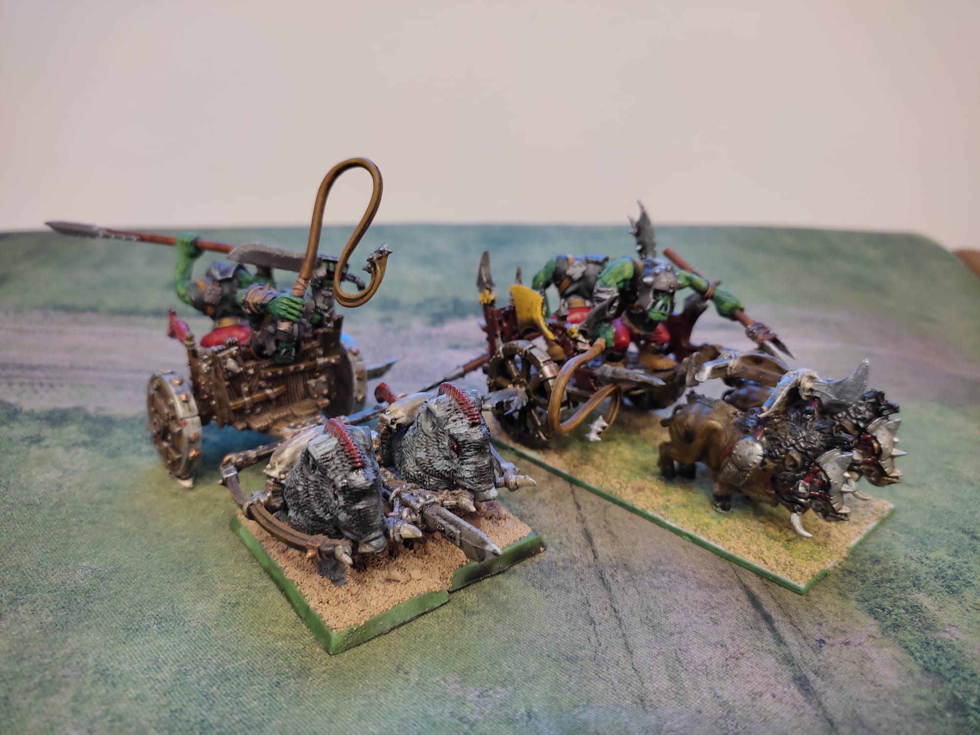 Lo lógico ahora hubiera sido ir a por todos esos apoyos: especiales y jabalíes, pero, justamente, los jabalíes es lo que tenía sin pintar. Tenía una “macropeana” de kings of war con 7 jabalíes de Mom, 5 pequeñitos jinetes de 6ª edición por pintar, piezas y algunos extra si hacía falta, y 4 carros goblins de kings of war tirados por jabalíes, y con aurigas orcos por pintar también. Así que es lo que más me cambiaría (de pintura) en función de los puntos totales, y lo dejé para el final.