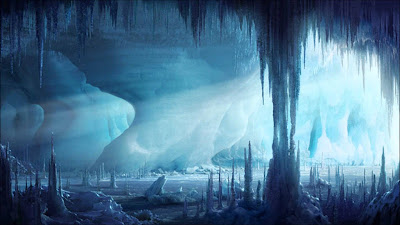 Cuando por fin lo logran, inquietos por oír reverberaciones en el vacío que se despliega ante ellos, los guerreros se hacen conscientes de la vastedad de la cueva que acaban de penetrar. El espacio es inmenso, pero la oscuridad y esa neblina azul impiden ver demasiado lejos, más allá de columnas de roca, montones que sobresalen entre la niebla, y pequeños montículos. Se percibe agua estancada, en forma de chapoteos esporádicos.