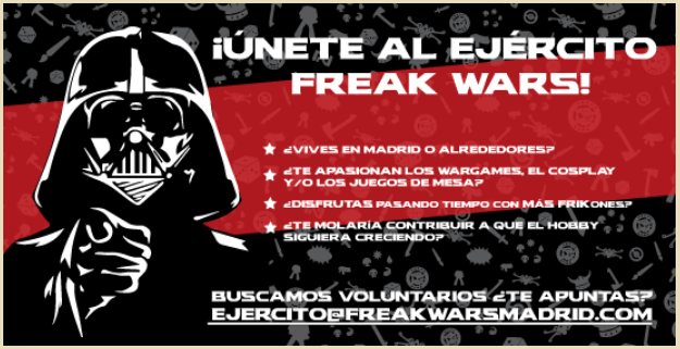 Pues como iba diciendo, los días 15 y 16 de septiembre, se celebran las Freak Wars, en Madrid. Estos dos días son como una convención de hobbies, y suelen ser los mejores sitios (del mundo mundial) para probar cualquier vertiente y ver si gusta. Yo no he tenido el gusto de asistir a nada parecido (bueno, asistí en Suecia el año pasado a la LinCon, que fue la ostia, y no sabría deciros cuántas horas y cuántos juegos de mesa jugué, pero fueron 4 días muy locos) y espero poder animarme este año. Me consta que algún otro miembro de Leyendas en miniatura si es bastante aficionado, es más, nuestro Hanscloud se planteó organizar un torneo de Fantasy (lamentablemente no ha podido ser), así que si nos véis por allí...¡saludadnos!