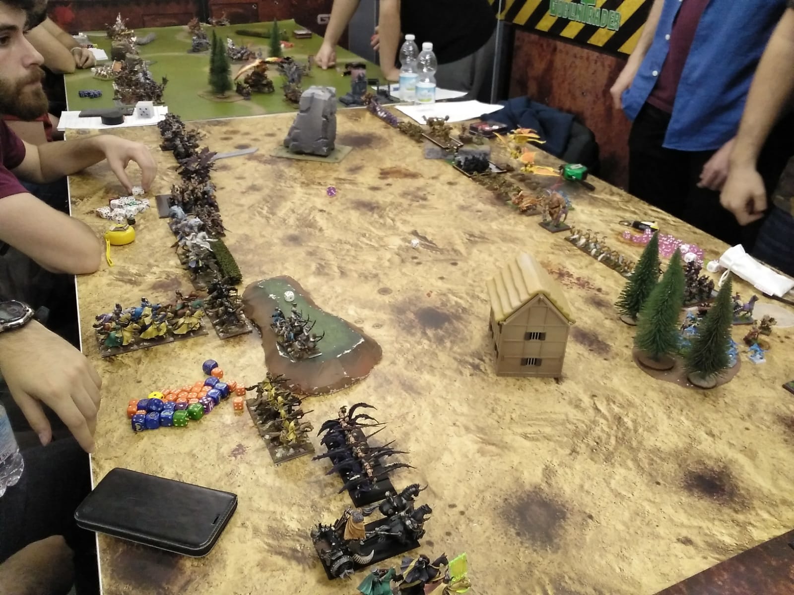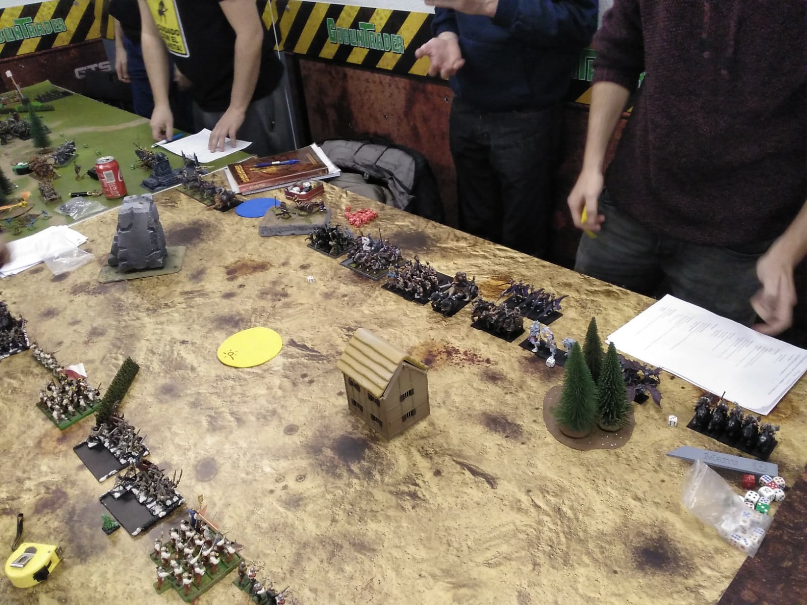 En la mesa 1 se habían enfrentado Rass (Altos Elfos) y Rubén (Imperio) contra Jorge (Orcos y Goblins) y Julio (Bestias del Caos) también empatando (ganaron los primeros de 3 puntos), y en la mesa 2 Hans (Imperio con lista alternativa de Marienburgo) y Manu (Caos Mortales) habían logrado una masacre a favor contra Dani (Hombres Lagarto) y Chus (Imperio) de 1727 puntos.