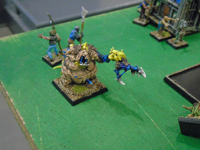 Me tocó jugar con David, que casualmente en la ronda anterior había estado en la mesa de al lado de la mía, así que habíamos hablado brevemente. David es seguidor del blog y me contó que después de un tiempo leyendo por ahí (Cargad! y tal) pues hace unos meses se había animado a retomarlo y hacerse un ejército, aprovechando que se mueve mucho mercado de Fantasy, pero lógicamente no había tenido tiempo de pintar demasiado. Me hizo mucho ilusión jugar con él la verdad, y espero que coincidamos más veces, porque ya le he dicho que esperaba que nos devuelva la visita. David se había decantado por hombres lagarto, probando un poquito de todo, quedándole una lista versátil. Además llevaba un personaje especial, Tetto'eko, que es un chamán eslizón en palanquín, y que no conocía de nada. ¡Pintaba entretenido, siempre se aprende algo!